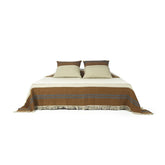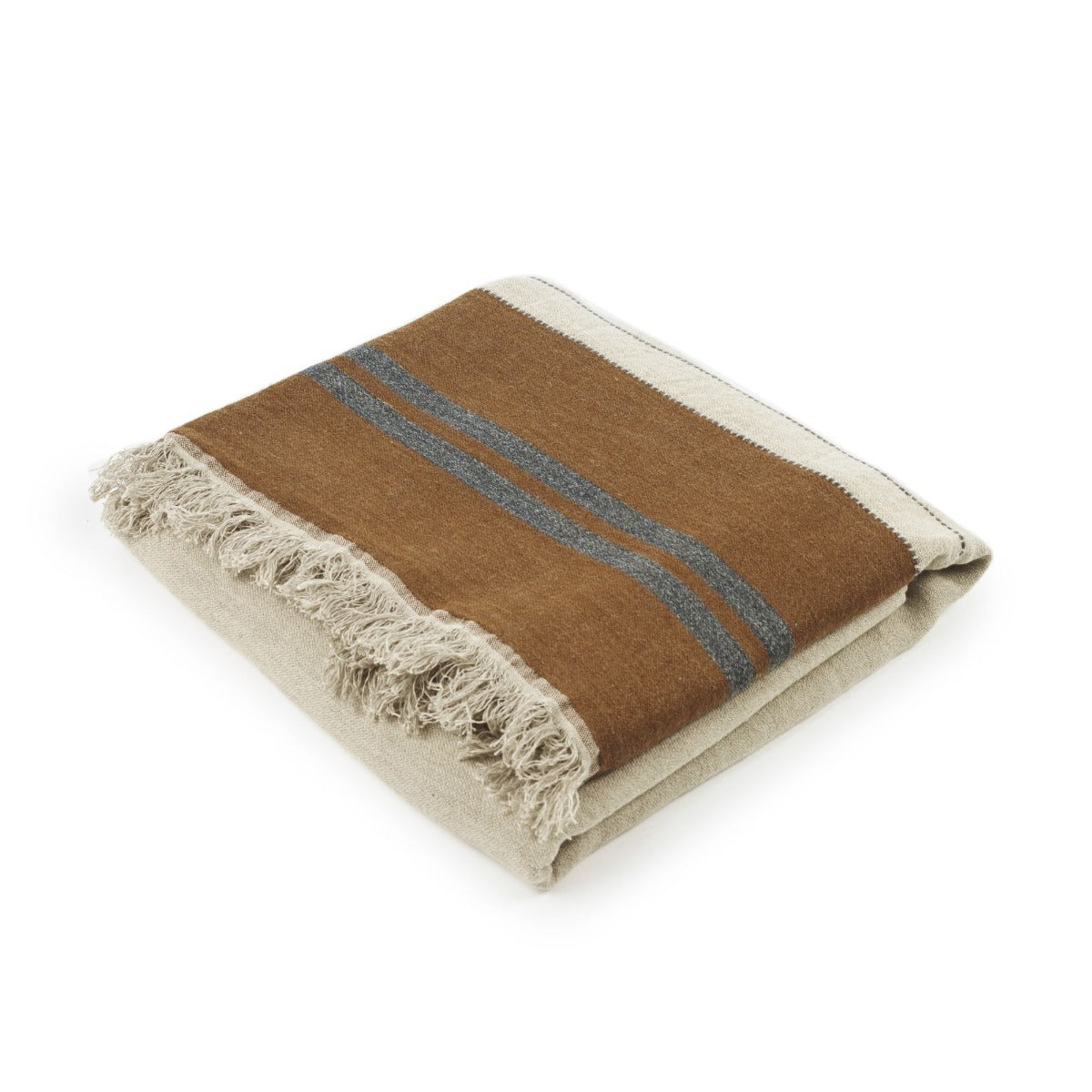 Bring warmth and character to your interior with the Highland Stripe linen-wool throw ! This luxurious throw combines linen and wool for a wonderfully soft and rich look. The ginger, leather, and smoky stripes on a neutral background create a natural, timeless look. Unique to this throw is the subtle center seam and fringed trim , while each end has a slightly different stripe patternβa playful detail that makes the throw extra special.