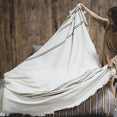 By popular demand, finally a new throw blanket: the Auburn Stripe linen throw blanket! This stylish blanket has a subtle, refined look with a center hem and fringes at both the top and bottom.